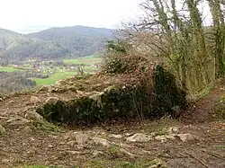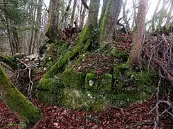 The castle was probably built in the 12th century, in order to protect the trade route from the Moravče Valley to the Lower Sava Valley. Its first recorded owner was Ulschalcus von Rabensberg, of the knights of Rabensberg (Slovene: Koprivniški), first mentioned in 1214. The castle was abandoned in the 13th century, when the owners relocated to Krumperk Castle, and it was in ruins by the 17th century.[1] The estate was inherited by the Hohenwarths, followed by the sisters of St. Clare from Mekinje. In the second half of the 19th century, the castle became known as Old Castle (Slovene: Stari grad) or Freight Castle (Tovorov grad), named after the nearby freight route from the Central Sava Valley.[1] In 1930, the land surrounding the ruins was purchased by Senator Valentin Rožič.[1] Remains visible today include the foundations of a defensive tower and some walls; most of the rest of the structure is covered by detritus. Much of the worked stone was recycled for the construction of nearby Holy Trinity Church.