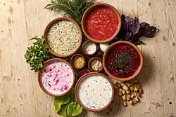The menu represents traditional Ukrainian cuisine dishes: nourishing borshch with pampushky (garlic donuts), dumplings, pancakes with various fillings, chicken Kiev (cutlets a-la Kyiv). “Korchma Taras Bulba” offers homemade potions and wines, liqueurs, Russian vodka or Ukrainian gorilka.[6] There is a special "express menu". * All agricultural products for “Korchma Taras Bulba” are grown at own farm "Kazachie" Ltd., situated in Ryazan Region.