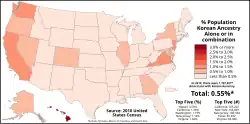 As of 2022, there are 1.5–1.8 million Americans of Korean descent,[9] of whom roughly 1.04 million were born abroad,[10] accounting for 8% of all Asian Americans and 0.5% of the total U.S. population.[11] However, prominent scholars and Korean associations claim that the Korean American population exceeds 2.5–3 million,[12] which would make it the largest community Overseas Koreans in the world, ahead of China's 2.1 million.