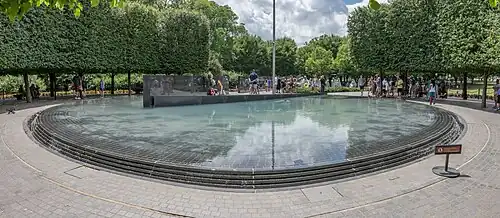 The circle contains the Pool of Remembrance, a shallow pool 30 feet (9 m) in diameter lined with black granite and surrounded by a grove of linden trees with benches. The trees are shaped to create a barrel effect, which allows sunlight to reflect on the pool.[10] Inscriptions list the numbers killed, wounded, missing in action, and held as prisoners of war, and a nearby plaque is inscribed: "Our nation honors her sons and daughters who answered the call to defend a country they never knew and a people they never met." Additionally, right next to the numbers of American soldiers are those of the United Nations troops in the same categories. In the south side of the memorial, there are three bushes of the Rose of Sharon hibiscus plant, South Korea's national flower.