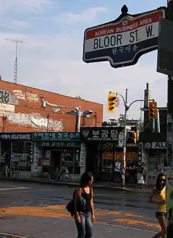 Koreatown (Korean: 코리아타운) is an ethnic enclave within Seaton Village, a neighbourhood of Toronto, Ontario, Canada. Located along Bloor Street between Christie and Bathurst Streets, the area is known for its Korean business and restaurants.[1] The ethnic enclave developed during the 1970s, as the city experienced an influx of Korean immigrants settling in Toronto. Toronto has the largest single concentration of Koreans in Canada with 53,940 living in the city, according to the Canada 2016 Census.[2]