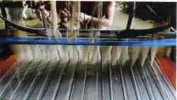 Jala system on handloom is a very primitive process, this system plays an important role in Korial saree weaving. A jala is a structure that looks like a hook. This system is mainly used for making buti designs on sarees. Jala process can include designs according to the desired area of the saree. When the design is incorporated into the saree, the jala is inserted in specific positions.