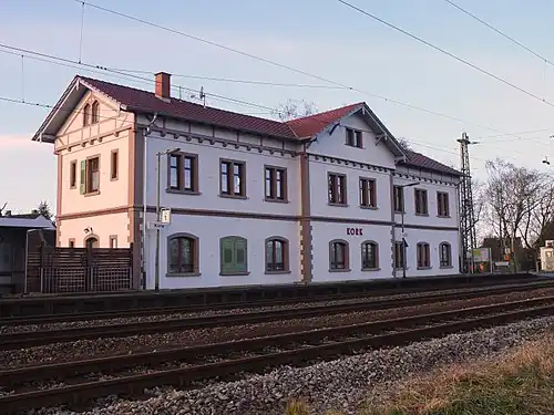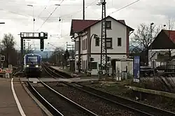Kork station (German: Bahnhof Kork (Kehl)) is a railway station in Kork, a suburb of Kehl, in southwestern Germany in the Ortenaukreis, Baden-Württemberg.[2] It is on the Appenweier–Strasbourg railway, with trains crossing the Rhine into France to reach the latter destination. Both sides being within the Schengen Area, no passport or border controls apply.