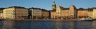 The square is named after the harbour Kornhamn where corn delivered to the city by ships from the Lake Mälaren area was embarked in the Middle Ages, the corn then stored on an open space called Korntorget ("Grain Square"). At the time, however, the city looked entirely different and the square in question was actually located where today the square known as Järntorget ("Iron Square") is found. The latter was renamed after the iron trade which grew in importance, and which also for a while gave Kornhamnstorg the name Jernbroen ("Iron Bridge"). The square probably was a product of the city plan created for the western part of the old town in the 1620s, though the space was referred to as Åkaretorget ("Carter Square") during that century, arguably because of the horse-drawn vehicles stationed there. Both historically and in modern times, the names Kornhamn and Kornhamnstorg have been used for the square, the harbour, and the present quay.[1] In the early 1740s, the harbour and its quays were restored together with to canal separating Riddarholmen from the rest of the old town.[3]