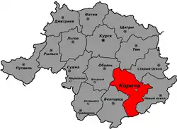 Korochansky County became an administrative unit in the mid-1600s. Korochansky county was part of the nearby settlements of the Belgorod defensive line. Korochansky county was formally abolished as an administrative unit in 1708 during the regional reforms of Peter the Great. Korocha became part of Kiev Governorate.[1] In 1719, the province was divided, and became part of the Belgorod Governorate of Kiev Governorate. In 1727, Beglrod province, consisting of Belgorod, Orel and Sevsk provinces was allocated. Korochansky county was restored as part of the Belgorod Province. In 1779, as a result of the reforms of Catherine the Great, the Belgorod Province was abolished. Korochansky Uyezd's boundaries were revised and it became part of Kursk Governorship. In 1796, Kursk Governorship became the Kursk Governorate. Part of the territory in Stary Oskol Uyezd became part of Korochansky Uyezd, but parts of Korochansky Uyezd became part of Novoskolsky Uyezd. In 1802, the borders were again revised. In 1918, parts of the uyezd were occupied by German troops. On 12 May 1924, the county was officially abolished and it became part of the Belgorod Uyezd.[2]