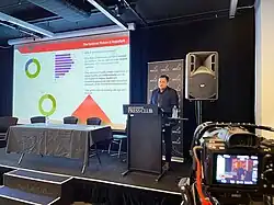 ![]() Samaras speaks at the March 2024 Melbourne Press Club multicultural media summit. | |