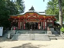 Koshikiiwa Jinja (越木岩神社, Koshikiiwa-jinja) is a Shinto shrine in Nishinomiya, Hyōgo, Japan. The other name of this shrine is Ebisu Daijingū. The focus of this shrine is a megalith called 'Koshiki-iwa', literally, 'Rice Steamer Rock', because ancient Japanese thought the shape resembled a traditional rice steamer. The height of the megalith is 10 metres with a circumference of 40 metres. The grounds of this shrine also include an outdoor sumo dohyo and a stage, possibly used for kagura.