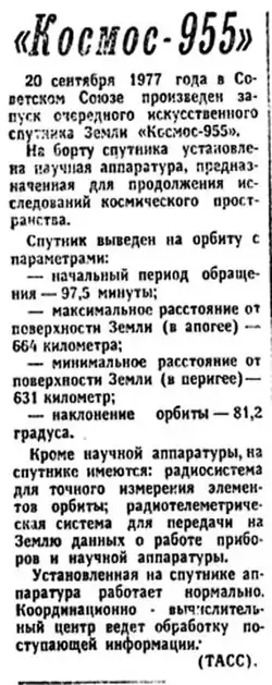 - ^ a b c "Cosmos 955". NASA. Retrieved 11 September 2012.