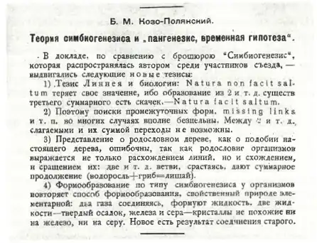 - ^ Agafonov, V.A.; Negrobov, V.V.; Igamberdiev, A.U. (2021). "Symbiogenesis as a driving force of evolution: The legacy of Boris Kozo-Polyansky". Biosystems. 199: 104302. Bibcode:2021BiSys.19904302A. doi:10.1016/j.biosystems.2020.104302. ISSN 0303-2647. PMID 33227379. S2CID 227157022.
