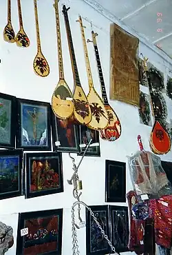 Lahuta is a typical Kosovar Albanian instrument which is formed by an arc and chord consisting of horse hair since 1950. Lahuta's shape is semi-spherical and covered with tanned leather which grips the sides of its wooden pegs. Lahuta often is decorated with symbols of ancient cults such as the head of the goat, snake, or historical figures. Lahuta's sound is nasal and fits very well with the content of epic songs.[8] From 2011 this old traditional instrument is protected by UNESCO. "Lahuta e xhubleta në UNESCO me kreshnikët", Gazeta Shqiptare, 29 March 2011, paragraph 1,4.[9]