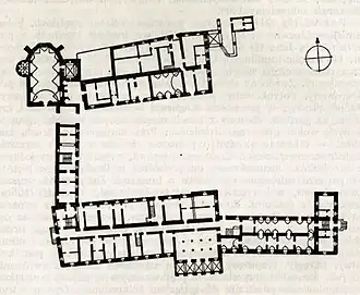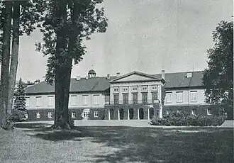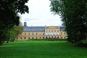 After passing through multiple owners, the estate was acquired in 1804 by the Prussian general Frederick Louis, Prince of Hohenlohe-Ingelfingen (1746–1818).[1] He had already gained possession of the Sławięcice (German: Slawentzitz) estate in 1782 through his marriage to Countess Amalie von Hoym and resided there.[1] His son, Adolf Karl Friedrich Ludwig, Prince of Hohenlohe-Ingelfingen (1797–1873), also served in the Prussian military and briefly held the position of Minister President of Prussia.[1] Between 1828 and 1830, he commissioned the construction of a new neoclassical palace in Koszęcin, incorporating older elements from the 17th century.[1] The design was created by the architect Albert Roch from Berlin, and the work was supervised by the architect Friedrich Wilhelm Degner.[2] The cornerstone was laid on 22 August 1828, the birthday of princess Louise, Adolf's wife.[2] The scope of work included the demolition of the southern wing and the transformation of the west wing in the central part, for which a new main entrance to the palace was designed from the park side, topped with a triangular tympanum. At the ends of the wing, two flanking avant-corps were added, on which there were originally observation decks.[2] The reconstruction also included the facades, which were given classicist features.[2]