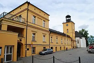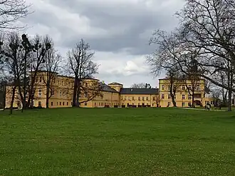 Koszęcin Palace (Polish: Pałac w Koszęcinie; German: Schloss Koschentin) is a neoclassical palace in Koszęcin in Lubliniec County, in the Silesian Voivodeship. It is one of the largest palace complexes from the neoclassical period in Poland. Originally a wooden castle, it was rebuilt in the 17th century as a brick residence and later transformed into its present form in the 19th century under the princes of Hohenlohe-Ingelfingen, a branch of the House of Hohenlohe.