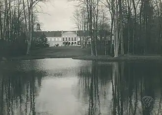 The palace is surrounded by an extensive English landscape park established in the mid-19th century.[6] In its western section, there is a picturesque pond. The park features small-leaved linden trees, chestnuts, maples, common beeches, sycamores, tall ash trees, and pedunculate oaks. Some exotic trees also grow here, including the Eastern white pine, Canadian and black pine, Canadian hemlock, London plane tree, and American ash. Many of these trees are designated as natural monuments.