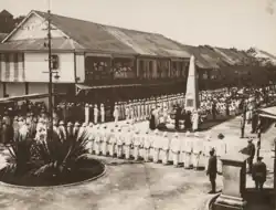 By the end of 1899, construction had started on shoplots,[25] a pier and government buildings.[24] This new administrative centre was renamed Jesselton after Sir Charles Jessel, who was the then Vice-Chairman of BNBC. Eventually, Jesselton became a major trading post of North Borneo, dealing in rubber, rattan, honey, and wax.[6][26] The North Borneo Railway was used to transport goods to the Jesselton harbour.[26] The Malay and Bajau uprisings during those times were not uncommon, and BNBC worked to quell the long-standing threat of piracy in the region. Jesselton was partially razed by the British during their retreat from the advancing Japanese and suffered further devastation when the Allies bombed it in 1945.[27] After the Japanese takeover of Borneo, it was again renamed Api. Several rebellions against the Japanese military administration took place in Api. One major rebellion in the town occurred on 10 October 1943 by a group called Kinabalu Guerrillas in the Jesselton Revolt consisting of local inhabitants. Japanese forces quelled the rebellion after its leader, Albert Kwok, was arrested and executed in 1944.[28] At the later stages of the war, what remained of the town was destroyed again by Allied bombings day and night for over six months as part of the Borneo Campaign in 1945, leaving only three buildings standing.[6] The war in North Borneo ended with the official surrender of the Japanese 37th Army by Lieutenant General Baba Masao in Labuan on 10 September 1945.[29]