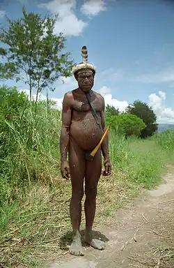 Many tribes can be identified by the way they wear the koteka. The koteka may be pointed straight out, straight up, or at an angle. The diameter of the koteka can also be distinctive to an individual tribe. For Hubula (Dani) people of Baliem Valley, the shape of horim is associated with the social status of the wearer. A curved horim toward the front (kolo) is worn by Ap Kain, the leader of Dani confederation, a curved horik to the side (haliag) is worn by Ap Menteg (war general) and Ap Ubalik (healer or cultural leader). A straight Horim is worn by ordinary people.[2] For Lani people, the angle is the marker of status. If the kobewak leans to the left the wearer is Apendabogur (war general). On the other hand if it leans to the right, the wearer is an aristocrat or rich. Straight kobewaks are worn by virgin men.[3]