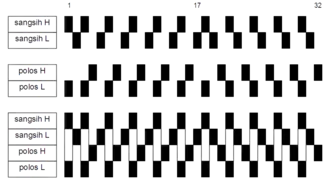 An example of kotekan empat (H=high, L=low) depicting the sangsih part (top), the polos part (middle), and their composite (bottom)[1]