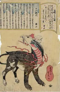 Kotobuki (寿; "congratulations") is a yōkai in Japanese mythology. The Kotobuki is a Japanese Chimera that has the parts of the creatures of the animals on the Chinese zodiac where it sports the head of a rat, the ears of a rabbit, the horns of an ox, the comb of a rooster, the beard of a goat, the neck of a dragon, the mane of a horse, the shoulders of a tiger, the arms of a monkey, the back of a boar, the hind legs of a dog, and the tail of a snake.[1]
