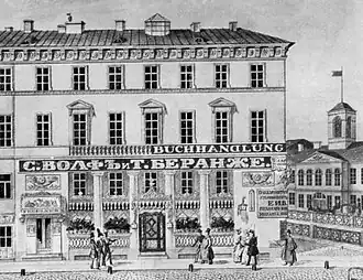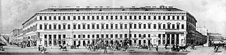 The first building at the modern location of Nevsky, 18 was constructed at the beginning of the 18th century. It was a small wooden house owned by Cornelius Cruys - the Vice Admiral of the Imperial Russian Navy and the first commander of the Russian Baltic Fleet, close associate of Peter the Great.[1][2] In 1738 the property passed to tailor Johann Neumann. He hired a famous architect Mikhail Zemtsov to build a new two story stone house. Neumann's house facade faced Moika, and the side to Nevsky Prospekt didn't even have windows. This shows that at the time, Nevsky didn't yet obtain its status of the main street in the Saint Petersburg. The house hosted the museum of wax figures - first in city, although it only existed for one year. Several boutiques operated in Neumann house. In 1743, German merchant Johann Albrecht was selling tableware made from serpentine stone, which supposedly rejected poison (considering the times, it was an attractive proposition). Frenchman Charpentier was selling powder, and Dutch merchant le-Roi had a shop "Rotterdam" selling chocolate, vanilla, and ink.[1]
