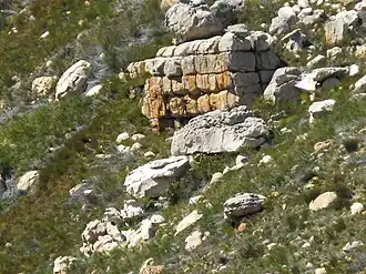 ![]() The Cedarberg sandstone that makes up the Koue Bokkeveld has intriguing patterns of erosion and cracking. Here a bus-sized block split naturally into regular brick-like right parallelepipeds. | |