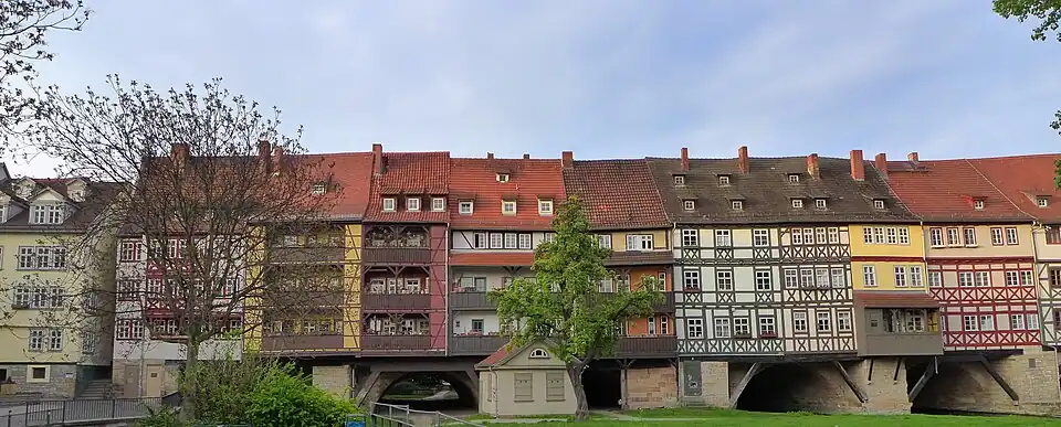 The construction of the houses on the Krämerbrücke was completed in 1486, following a fire in 1472 which destroyed nearly half of the city and the market stalls on the stone bridge.[3][5] Sixty-two timber-framed buildings were built on each side of the stone bridge, creating a street between the two rows.[5] Later, the small houses were gradually merged, so that there are now 32 houses on the bridge. They have shops on the ground floor and living accommodation above.[7] They are the longest rows of inhabited buildings on any bridge in Europe.[8]