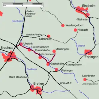 During the time up to 1874 when the city of Bruchsal became a railway hub, the municipalities along the Kraichbach were interested in obtaining a connection to the railway. Therefore, Bruchsal sought a railway in the Kraichbach valley through the towns of Ubstadt, Unteröwisheim, Oberöwisheim, Münzesheim and Gochsheim to Eppingen. However, the opening of the Kraichgau Railway on the Karlsruhe–Bretten–Eppingen route in 1879 delayed the construction of such a line.