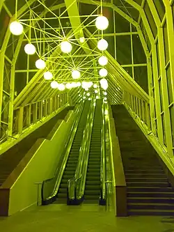 The main pedestrian walkway and stairs are fully covered by a glass canopy, providing a sheltered experience. Additionally, there are two side walkways that are usually not accessible to the public, but are open-air spaces. These side walkways offer a different atmosphere compared to the enclosed main walkway. The piers and staircases along the shoreline are constructed using grey stone and are designed to resemble the approaches of the original Krasnoluzhsky bridge, although they are slightly simplified in their appearance.