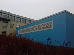The exposed wall of the GSIA Building (home to the Tepper School of Business) was painted blue and has a quotation by Ludwig Wittgenstein, displayed with the words in reversed order, in black and white porcelain tiles. The quotation concerns the arrow of time and is displayed as follows: