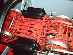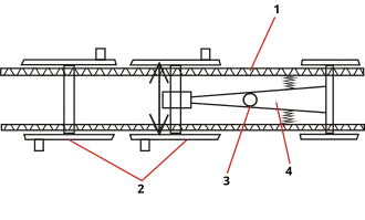 The bogie comprises a carrying axle connected to a coupled axle via a shaft or lever. In straight running, any radial movement of the carrying axle results in a sideways movement of the coupled axle in the opposite direction.[1] However, the carrying axle is centred by means of two heavy duty springs just behind it. In addition the pivot pin may be allowed to move sideways, but again is held centrally by heavy springs. When travelling round a curve, the carrying axle swings to one side causing the coupled axle to move sideways in the opposite direction. In this way radial forces during curve running are more or less evened out on both axles, so that riding qualities similar to those of a normal bogie are achieved and wear and tear reduced on wheel flanges and rails.