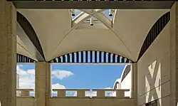 The architect's special consideration for the use of natural light and the articulation of structure, expressed by the travertine-covered reinforced concrete frame, the slim vaults covering each 22-foot module, or the baluster-like posts of the steel trusses that separate each vault, is paramount and complements the clarity of the plan. Without knowing the architect's intention, visitors experience an unusual calm in moving from one space to another. The particular dimensional units of similar size and the attention of the architect to progression through them is the "secret" to the pleasure of experiencing this particular building.[2]