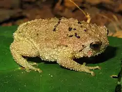 Krefft's warty frog is a sturdy frog with a short snout, visible tympani behind the eyes and short legs. It can grow to a length of 41 millimetres (1.6 in). The fingers and toes are short with wide toe pads. The dorsal surface is glandular and densely covered with small warts and the general colour is greyish-brown, rusty brown or greyish black. The underside is paler. This species could be confused with Breviceps mossambicus but that species lacks the large, square-ended toe pads which help Callulina kreffti to clamber about in trees.[2][3]