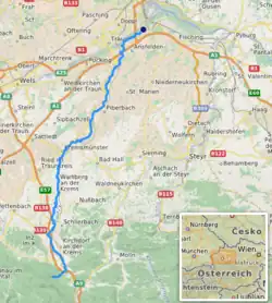 It originates at the foot of the mountain Kremsmauer in Micheldorf, runs northwards in the Traunviertel through the Upper Austrian Prealps, and flows into the Traun in Ebelsberg, a district of Linz.