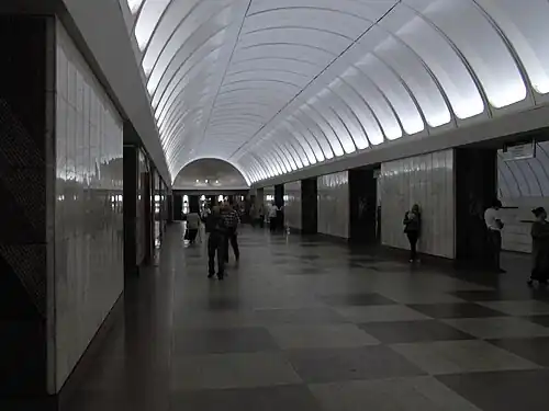Like its neighbour Rimskaya the station lacks an underplatform service areas and rests on a monolithic plate. At a depth of 47 metres the station is tri-vault wall-columned (i.e. the intercolumned space has been filled up to give extra strength). The architects Nikolay Shumakov and Nataliya Shurygina applied a Peasant Labour theme to the decoration which included a bright marble and aluminium layout of the station and decorative mosaics at the ends of the columns (artists N.Andronov and Yu.Shishkov). The floor is covered in checkered pattern of black and grey granite and the lighting is hidden in the niches of the vault.