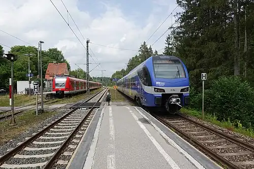 Kreuzstraße station is a railway station in the Kreuzstraße district of the municipality of Valley, located in the Miesbach district in Upper Bavaria, Germany.