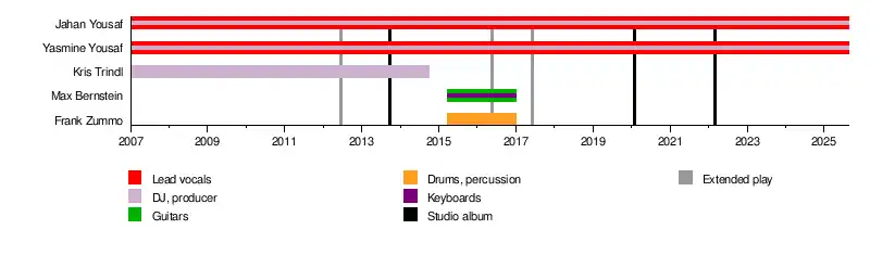 The band consists of sisters Jahan and Yasmine Yousaf.[1] Originally a trio, their third member and producer Kristopher Trindl left the band in 2014.[9] The band's name stems from Jahan's misspelling of the word "cruel" when the two began writing music, and is not a reference to Cruella de Vil.[10]