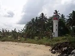 The lighthouse was built in 1906[1][3] by the German colonialists who had occupied Kamerun (the lighthouse and a church are the legacy of German colonial construction in the town[4]); today it is part of Francophone Cameroon.[5] In the early days there was a keeper's cottage by the lighthouse, but that has since been removed.[3] Today, it is by the beach resort of Kribi and just north of the tourist destination[6] Lobe Waterfall.[7] The location of the lighthouse at Kribi matched the town's status as the centre of trade for the southern region, which was notable for trading rubber and ivory.[8][9]