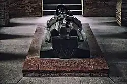 In the middle of a rectangular pit an open crypt is located, containing the statue of a fallen soldier.