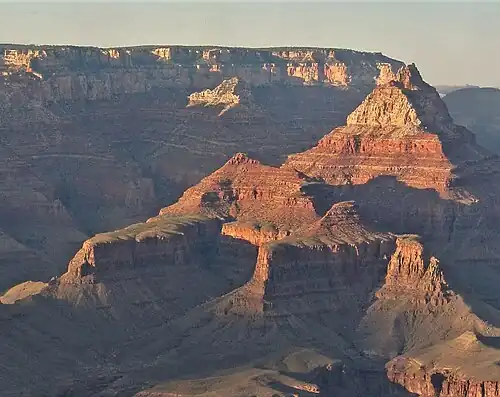 Krishna Shrine is a 6,131-foot-elevation summit located in the eastern Grand Canyon, in Coconino County of northern Arizona, US. The landform is attached at the southwest to the Vishnu Temple massif, about 1.0 mi distant. Krishna Shrine is about 3.0 mi south of the Cape Royal overlook, Walhalla Plateau (southeast Kaibab Plateau, North Rim). A twin landform occupies the southeast of Vishnu Temple, the Rama Shrine. Krishna Shrine towers about 4,000 ft above the Colorado River, about 2.0 miles south. Both Shrines, east and west, and Vishnu Temple, center, are at the headwater drainage of Asbestos Canyon. At the southwest of Krishna, on an extending arm of Redwall Limestone is a short unnamed drainage; (at the southwest is Newberry Butte at the Colorado River, and Granite Gorge). The west flank of Krishna Shrine drains into the long southwest-trending Vishnu Canyon and Creek, which comes from Freya Castle and the Walhalla Plateau, South Rim.