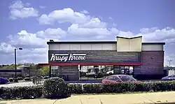 The store struggled during the Great Depression. In 1934, Vernon and Ishmael decided to move to the larger city of Nashville, Tennessee, where they hoped business would be better. The uncle and nephew focused solely on selling their doughnuts and opened "The Krispy Kreme Doughnut Company" in a rented store on Gallatin Road.[5] The shop did so well that Vernon's father, Plumie, also left Kentucky and moved to Nashville to help sell doughnuts. In 1937, Rudolph opened his own store, deciding on Winston-Salem, North Carolina, for the location when he learned that his favorite cigarette company, Camel Cigarettes, was headquartered in the small North Carolina city.[5] Rudolph primarily sold to convenience stores; however, he also sold hot doughnuts to individual customers who came during production time between midnight and 4 a.m.[5] The first store in North Carolina was located in a rented building at 534 South Main Street in Winston-Salem in what is now called historic Old Salem. The Krispy Kreme logo was designed by Benny Dinkins, a local architect. The first Krispy Kreme bakery outside the South opened in Akron, Ohio, in 1939.