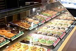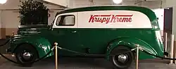 Krispy Kreme, Inc. (previously Krispy Kreme Doughnuts, Inc.) is an American multinational doughnut company and coffeehouse chain. Krispy Kreme was founded by Vernon Rudolph (1915–1973), who bought a yeast-raised recipe from a New Orleans chef, rented a building in 1937 in what is now historic Old Salem in Winston-Salem, North Carolina, and began selling to local grocery stores.[3][4] Steady growth preceded an ambitious expansion as a public company in the period 2000 to 2016, which ultimately proved unprofitable. In 2016, the company returned to private ownership under JAB Holding Company, a private Luxembourg-based firm. In July 2021, Krispy Kreme became publicly traded again on the Nasdaq.[1] The brand name is a deliberate non-standard spelling of "crispy cream", for marketing effect.