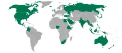 The first Krispy Kreme store to open outside North America was in Penrith, part of metropolitan Sydney in Australia.[30] The second Krispy Kreme store that was opened internationally was in the United Kingdom and was in Harrods department store London. It closed in June 2011. As of 2018, there are over 100 stand alone Krispy Kreme stores in the UK, and a presence in 500 Tesco stores.[31] Besides the stores that Krispy Kreme operate in the United States and Canada, there are also locations in Egypt, France, the United Kingdom, Australia, New Zealand, South Africa, Lebanon, Turkey, India, the Dominican Republic, Iceland, Ireland, Kuwait, Guatemala, Mexico, Costa Rica, Panama, Russia, Taiwan, South Korea, Malaysia, Thailand, Brazil, Indonesia, the Philippines, Japan, Singapore, Cambodia, Jordan, the United Arab Emirates, Qatar, Saudi Arabia, Bahrain,[32] Hong Kong, Nigeria, Ethiopia, Jamaica and Chile.[33]