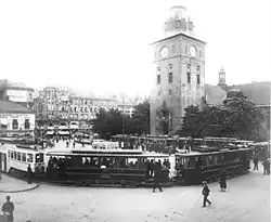 KSS had a concession which expired in 1905, at which time the municipality could purchase the company at par value. This raised a new debate concerning public or private operations, with many Conservative politicians calling for the privatization of KKS.[27] In the 1904 municipal election the issue was raised, with the Liberal Party and the socialist parties running for municipalization of tram operations. Meanwhile, the municipal administration worked with estimates for taking over KSS. A take-over would cost the municipality about NOK 2 million, while a sale would bring in about NOK 1.6 million. However, as KSS was a profitable company, it was estimated that the municipality would make more money by taking over KSS than selling KKS, estimated at about NOK 3 million for the period in question. The decisive municipal council meeting was held on 14 April 1905, although the actual vote did not occur until 02:00 hours the following day, after a nine-hour debate.[28] The Conservative majority voted in favor of selling KKS to KSS and extending the latter's concession to 1924.[29]