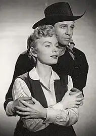 In 1954, Miller appeared as the second leading lady in three films. Flight Nurse (1954), starring Joan Leslie, was a drama about US Air Force flight nurses in the Korean War. Miller is a fellow officer of Leslie, involved in a romantic triangle with two pilots. Production ran May 14–mid-June 1953.[55] Geraldine (1954) is a comedy starring Mala Powers. Production ran late June to mid-July 1953.[56] In the noir Western Hell's Outpost, Miller again costarred with Leslie. Production ran July 8–late July 1954.[57] Hell's Outpost introduced Miller to Jim Davis, who would be the male lead for the only television series that Miller had a continuing role in. During the 1950s, both Joan Leslie and Miller, by now friends, were involved with fundraising for St. Anne's maternity hospital in Los Angeles.[37] During that year, Miller made two appearances on the television series The Lone Wolf, starring Louis Hayward. In one episode, Miller played an adulterous wife reminiscent of The Shadow on the Wall, but is shot by her cuckolded husband instead. She made a guest appearance as Mrs. Manning on Republic's first television series, Stories of the Century, starring Mary Castle and Miller's old Hell's Outpost costar, Jim Davis.