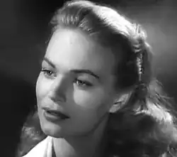 In 1946, Miller was loaned out to Monogram Pictures. She played a model in the 1946 film noir, Suspense, where she appears as a party guest. Production ran mid-October–early December 1945.[15] Around this time, Miller moved into the old Wallace Reid mansion in Coldwater Canyon, then converted into a boarding house for aspiring actresses known as "The House of the Seven Garbos".[16][17] Among the boarders were Ruth Roman, Suzan Ball and Linda Christian.[18] According to Doris Lilly,[19] a former boarder and later society columnist, "The dignity of the house in general was presided over and encouraged by Kristine Miller, who was blonde haired, high of cheekbone, grey eyed. Kristine had balance, she would check some of our madder impulses, kept us calm when that was necessary. Her manner was quiet and refined, and she had a way of touching a grubby coffeepot as if it were the tiara of the Empress Josephine. In spite of her reserve, we all knew that Kristine had a fine future for her somewhere, and we felt that she was an excellent actress."[20]