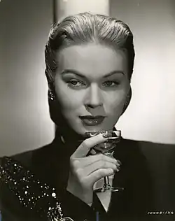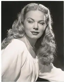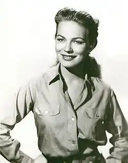 Having lived in Argentina and Denmark as a child, she spoke English, Spanish and Danish fluently, and had a working knowledge of Portuguese and German.[9] During her formative years, she showed no interest in acting. Miller said of her childhood, "My mother was a professional singer and I think she was eager for me to go into the entertainment field."[7][10] However, after she played a main role in her high school's production of George S. Kaufman's The American Way (1939), her taste for show business began to form. In one version of how she was discovered by Hollywood, in 1944 the 18-year-old Miller saw an opportunity when a Warner Brothers talent scout was to attend one of her school's performances. The scout never showed up, so she sent a letter and photograph to the studio, and garnered a screen test at Warner, where she changed her name to Kristine Miller.[6][11] When Miller set out for Hollywood, she recalled, "People said to my mother, 'Are you letting that girl go to that awful place?'" But her mother replied, "I know that girl, and she'll be all right."[12] Although she failed the screen test, she was noticed by producer Hal Wallis, who was then feuding with the studio head, Jack L. Warner. Under acrimonious circumstances, Wallis left Warner Brothers for Paramount Pictures. Wallis brought with him Miller and another actress that also failed a screen test at Warner, the 21-year-old Lizabeth Scott.[13]