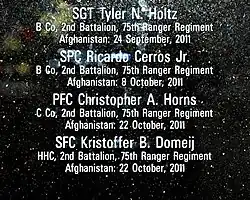 - On February 8, 2011, the names of fallen Rangers SFC Kristoffer Domeij, Pfc. Christopher Horns, Sgt. Tyler Holtz, and Spc. Ricardo Cerros Jr. were inscribed on the memorial obelisk at 2nd Battalion's headquarters in Joint Base Lewis-McChord, Washington.[16]