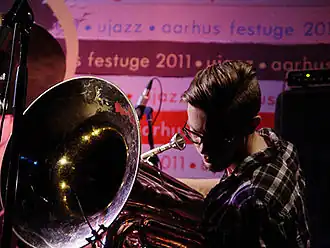 Lo has redefined the use of tuba and its role in band. From its traditional role as the low-end in symphony orchestras and Dixieland bands, he has taken the instrument to a new direction, filling the position as the ultra low end in metal- and noise bands. With a bunch of electronics and huge amps, Kristoffer’s tuba sounds like a low-end monster and a high pitched squeal at the same time. He is a part of bands like Pelbo, Trondheim Jazz Orchestra, Microtub, Sunswitch and Highasakite.[2][3]