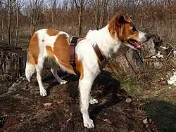 The Kromfohrländer is of medium size, with a height at the withers in the range 38 to 46 cm. Dogs weigh some 11–16 kg, bitches about 2 kg less.[5]: 156 There are two types of coat, a rough-haired (Rauhaar) and a smooth-haired (Glatthaar): the rough is coarse-haired and bearded, with longer hair on the muzzle and face, while the hair coat of the smooth variant is soft and lies close to the body. The coat is thick in both types, with soft undercoat; hair length ranges from 3 to 7 cm.[2]: 218 [7] The coat is white with patches of brown, this ranging from light brown through red-brown or tan to very dark; on the head the brown forms two symmetrical patches including and surrounding the ears and extending to the eyes and cheeks, while on the body it may appear as a saddle or as one or more irregular patches.[2]: 218