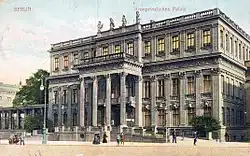 The Kronprinzenpalais (English: Crown Prince's Palace) is a former Royal Prussian residence on Unter den Linden boulevard in the historic centre of Berlin. It was built in 1663 and renovated in 1857 according to plans by Heinrich Strack in Neoclassical style. From 1919 to 1937, it was home to the modern art collection of the National Gallery. Damaged during the Allied bombing in World War II, the Kronprinzenpalais was rebuilt from 1968 to 1970 by Richard Paulick as part of the Forum Fridericianum. In 1990, the German Reunification Treaty was signed in the listed building.[1] Since then, it has been used for events and exhibitions.