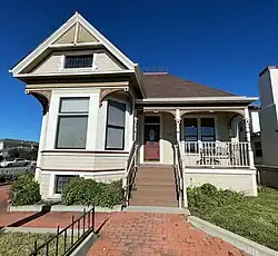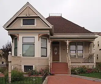 The Krough House is a one-story, wood-frame, single-family residence built in a Queen Anne style. It has redwood siding with a pitch gable roof covered with composition shingles. A small window appears just above two bay windows located at the front of the house. A staircase leads to a redwood paneled front door and porch. The rear of the house has a sun porch and rear entrance. The house has a small cellar with an entrance outside. In the 1890s, Central Avenue was a street of many Queen Anne houses. Today, the Krough House is one of only four of the houses remaining.[2][3]