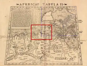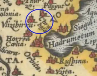 Al Bahi[1] suggested that Kroussia was the Roman city Chrausa (Greek:Χράῦσα ; Arabic:خراسا) based on Ptolemy, which was also designated as Chrabasa (Greek:, Χράβασα; Arabic: خرباسا)in Procopius' texts.[4][5] Based on Müller and Fischer,[4] Chrausa has the following longitude and latitude in Ptolemy's map: (longitude: 36°; latitude: 32° 40′) and should be located under the city of Hadrumetum (now the city of Sousse) and near Aphrodisius. These coordinates were used to estimate the location of Chrausa in the Map of Ptolemy (produced by SANDERUS Antique maps & books).[6] Abraham Ortelius featured Chrabasa (Chrausa) in the map of North Africa produced in 1590 using the great map of Africa of Giacomo Gastaldi and Siculus Diodorus.[7]